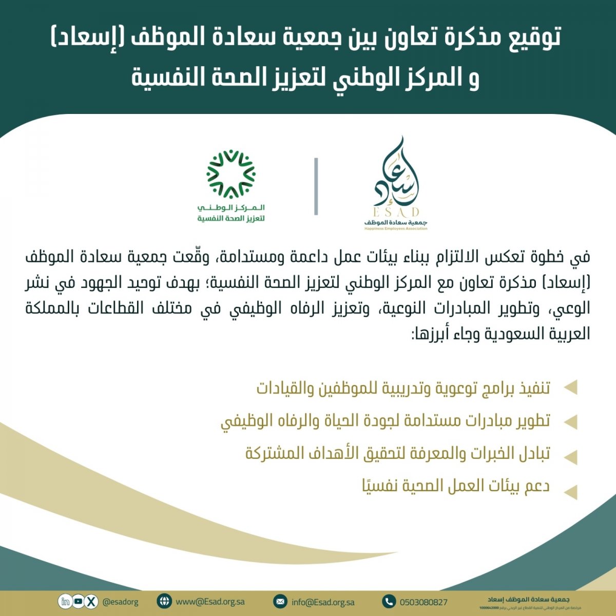 نبذة عنا الجمعية السعودية للبيئة التنظيمية لعمل الموظف (إسعاد) جمعية سعودية أهلية، مرخصة من المركز الوطني لتنمية القطاع غير الربحي برقم (1000642000) وتاريخ 9 سبتمبر 2024، بإشراف وزارة الموارد البشرية والتنمية الاجتماعية للمساهمة في برنامج تنمية القدرات البشرية أحد برامج رؤية 2030.